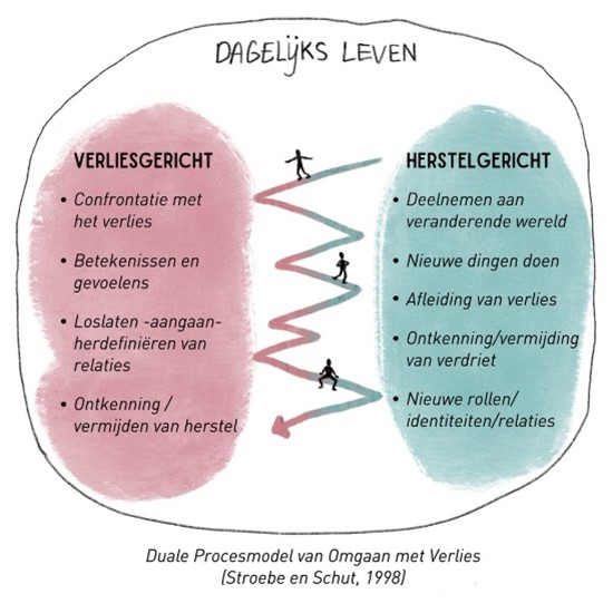 In het bekende rouwmodel van Stroebe &Schut is een duidelijke weergave gegeven van hoe een rouwproces zou kunnen verlopen.